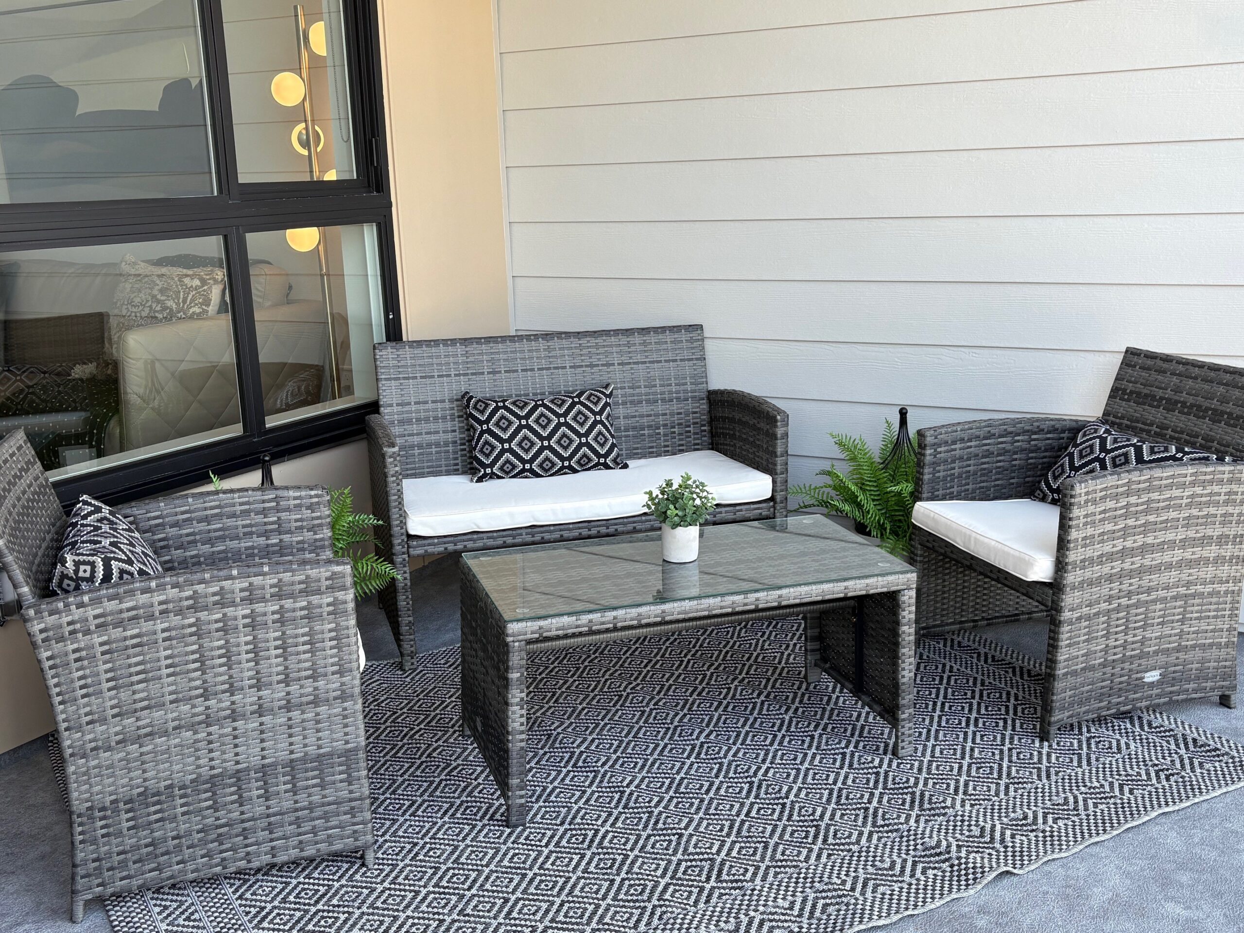 - Woodgrain cabinetry with soft-close hardware